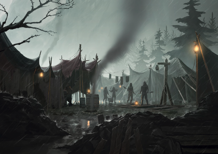 The envoys continue following the path, leaving Fernex behind. The path ends at a campground. Thread skilfully scans the camp and notices an exception: Amongst the men, who are of no known clan, stands Emissary Neva.
