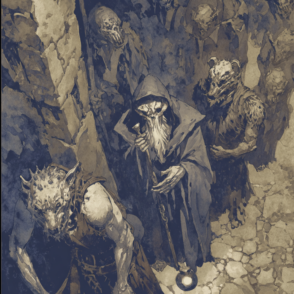 A group of villagers returns to the Underground Temple they went the week before. They are Artea, Waximillian, Oswin, Seren, Pela Croftman and Beatrix. During an investigation on the lower level, the group finds themselves cornered by a large group of heavily robed, grotesque men. They name them mimics.